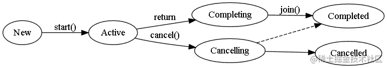 - Active -> Completing: 当协程完成了它的主体逻辑时,它会从Active状态转换为Completing状态。这个转换可以由return语句或者异常抛出触发。