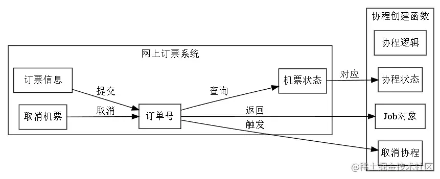 首先,我们来通过一个比喻,来说明Job和协程的关系。假设你要去旅行,你需要订一张机票。你可以通过网上订票系统来完成这个任务。当你提交了你的信息和支付方式后,网上订票系统会给你返回一个订单号,这个订单号就相当于一个Job。通过这个订单号,你可以查询你的机票状态,比如是否已经出票,是否可以改签或退票等。如果你改变了主意或者有其他原因,你也可以通过这个订单号来取消你的机票。