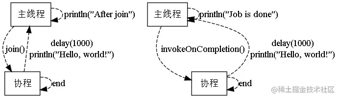 除了查询和控制协程的状态外,我们还可以通过两个方法来等待或监听协程的完成事件,以便在协程结束后做一些后续处理。这两个方法分别是: