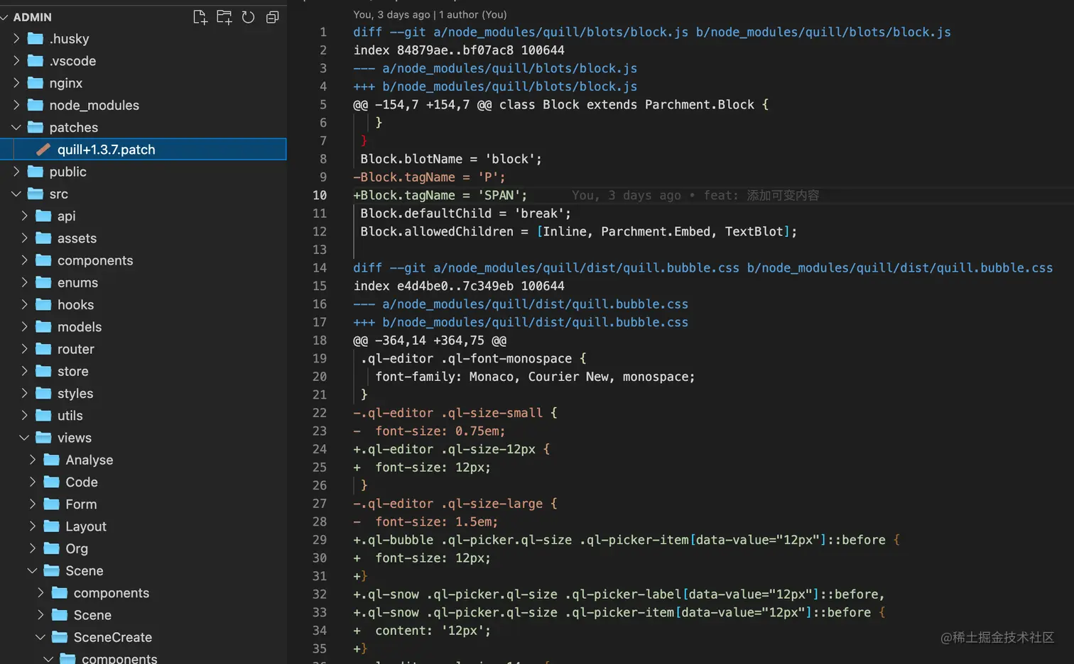 其中package-name是指要进行修改的依赖包名称。执行该命令后会在项目根目录中自动创建一个 patches 文件夹,该文件夹中就会出现一个 package-name+version.patch 的补丁文件,如quill+1.3.7.patch