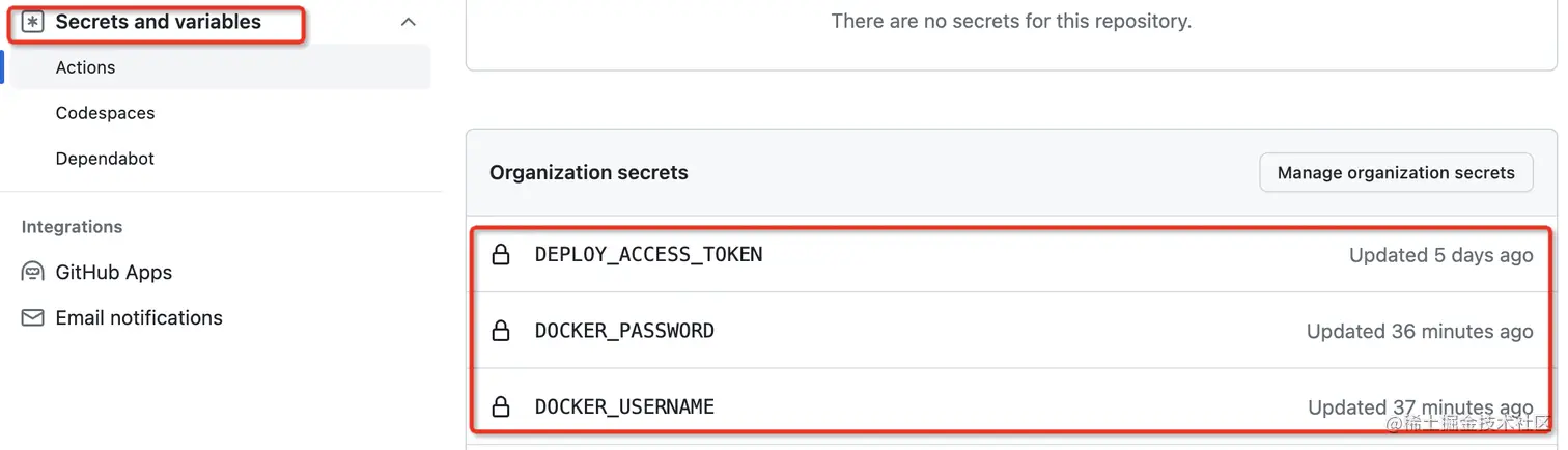 我们需要源码仓库的工作流自动触发部署清单仓库中的工作流,此时需要创建具有 Github CI 操作权限的 secrets.DEPLOY_ACCESS_TOKEN 以及 Docker Hub 镜像推送的账号信息 secrets.DOCKER_USERNAME 和 secrets.DOCKER_PASSWORD, 这些可以在 Github 仓库的 Secrets and variables 设置中进行配置,如下图所示