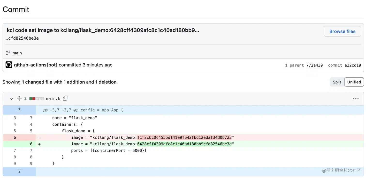 当业务仓库 Github CI 流程执行完成后,会自动在存放 KCL 资源配置的仓库触发一个 CI 自动更新配置并提交到 flask-demo-kcl-manifests main 分支,commit 信息如下