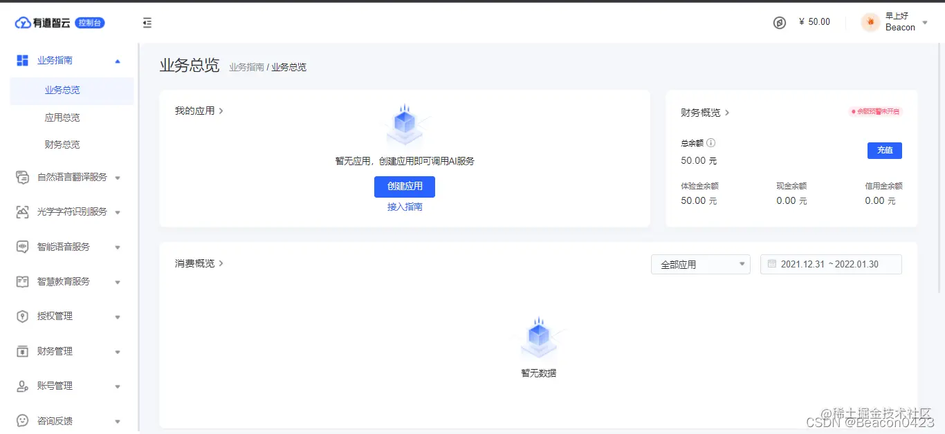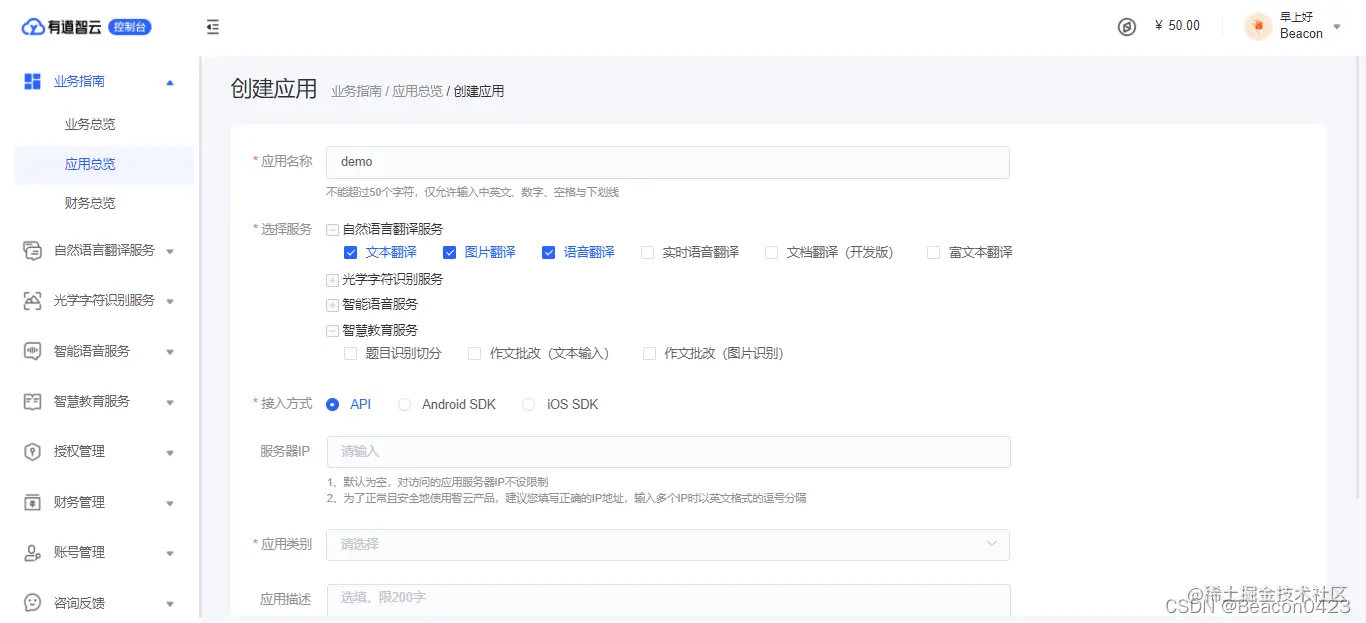 2.登录进来后,创建应用。根据需要选择语言翻译服务。