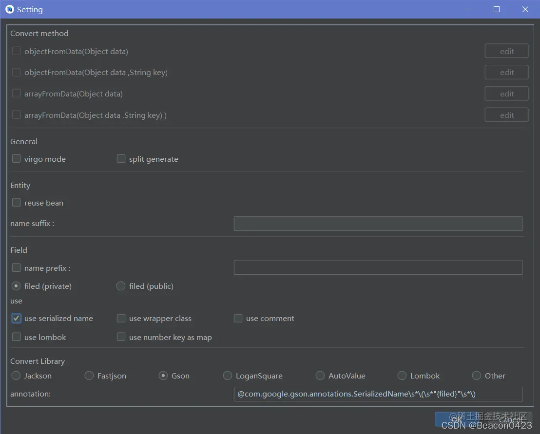 新建Java类来接收这个json文件,Alt+Insert或者右键选择Generate,选择GsonFormatPlus,会跳出这样一个对话框