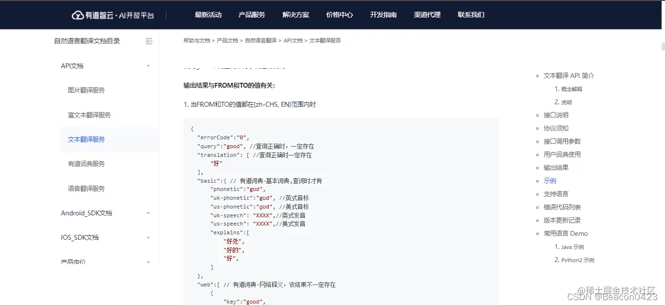 2. 打开有道云文本翻译API接入文档,找到json文件示例