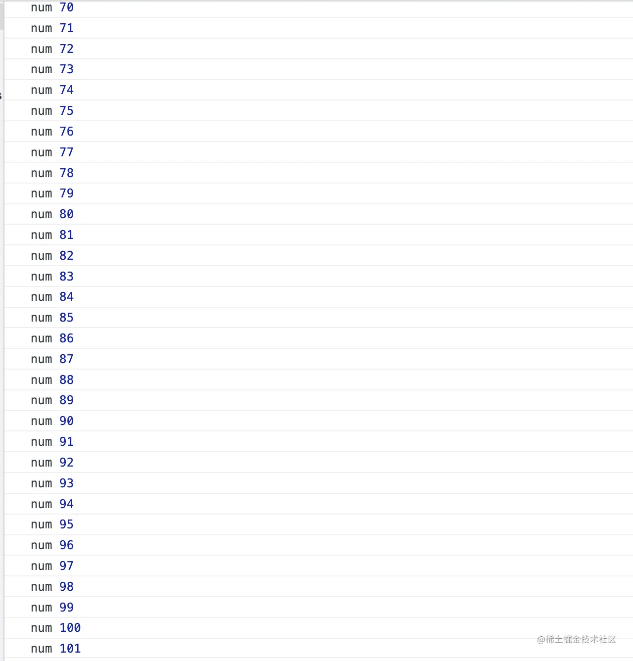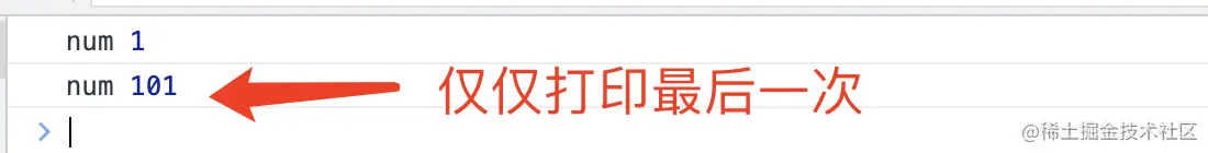 - 利用Promise微任务的特性,当num被更改100次之后同步代码全部执行结束后,then回调将会被执行,此时num已经是101,而jobQueue中也只有一个fn,所以最终只会打印一次101