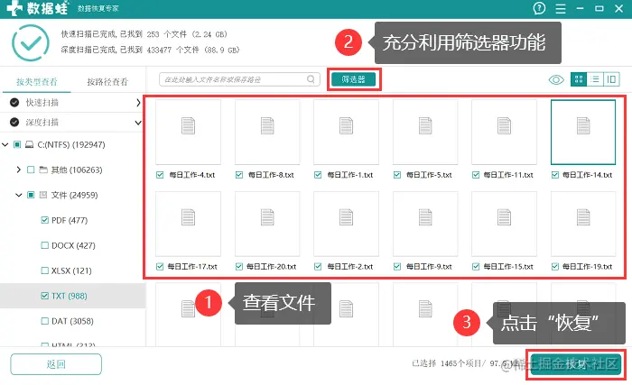 3.第二次扫描可能需要花费较长时间,请耐心等待。扫描完成后,可以对结果进行选择和查看,可充分利用【筛选器】的筛选功能找到需要恢复的文件,点击【恢复】;
