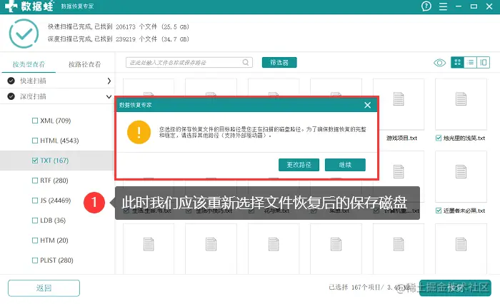 4.此时我们可以对文件恢复后的保存位置进行选择,如果选择的位置与扫描磁盘一致,软件会进行提示,此时需要重新选择另一个磁盘。
