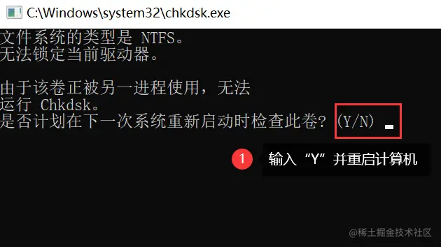 - 系统会询问是否在下次启动时运行磁盘检查,输入【Y】并重新启动计算机;