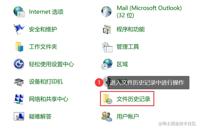 1.在电脑的 【控制面板】 中进入【文件历史记录】;