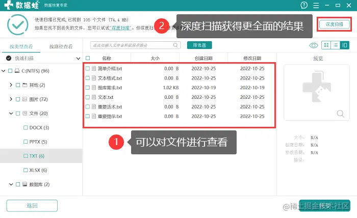 2.第一次扫描结果出现较快,我们可以对结果中的文件进行查看和选择,如果没有完全找到需要恢复的所有文件,点击【深度扫描】;