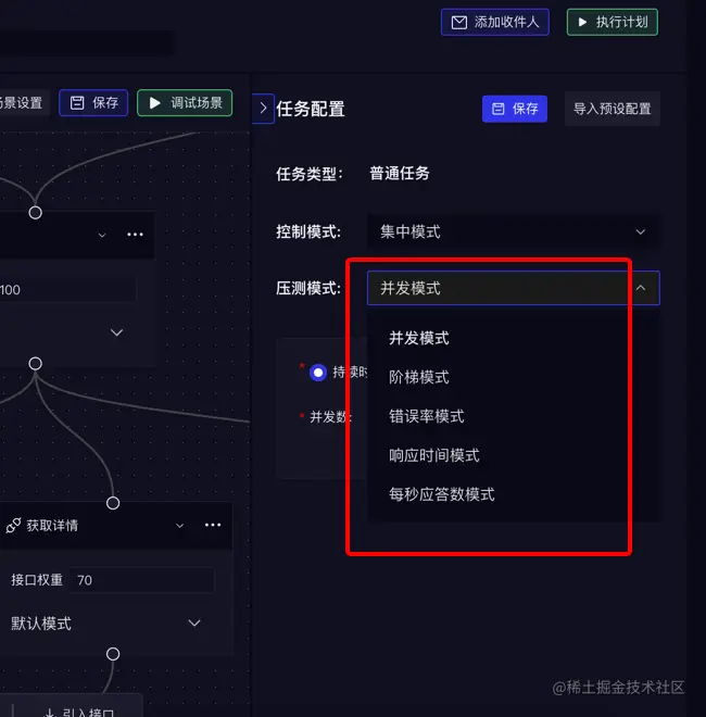 压测模式选择:提供了五种压测模式选择:并发模式、阶梯模式、错误率模式、响应时间模式、每秒应答数模式。无需安装插件。