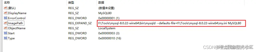 PS:如果已经安装过了,Mysql服务中间的可执行文件路径和Mysql安装目录不一致,导致mysql服务启动失败,此时需要修改可执行路径。 1.cmd 输入 regedit,打开注册表。 2.找到mysql服务注册表,