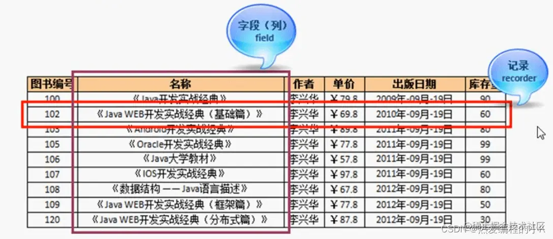 - 即,将信息按照"(图书名称,出版社,作者,价格,出版日期)"的方式组织在一起,这样就组成了一条记录。