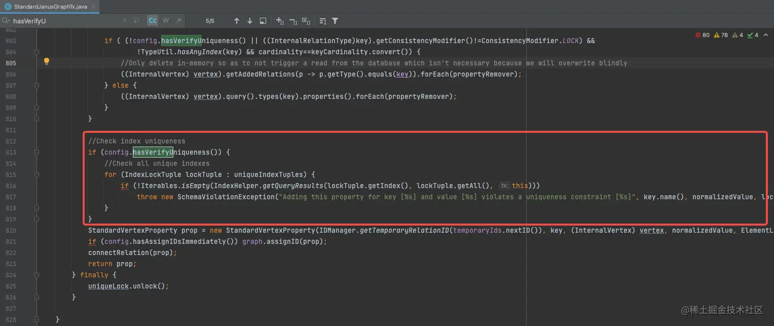 通过分析,火山引擎 DataLeap 研发人员发现guid在全局上默认是唯一的,没有必要做这个唯一性检查,同时,我们定义了业务语义上全局唯一的qualifiedName,以此减少不必要的唯一性重复检查。