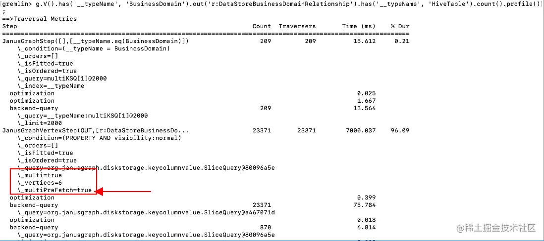 开启JanusGraph的MutilPreFetch查询开关,是其中一种情况。该特性的大致实现原理是,在属性过滤的时候, 批量并行获取所有关联顶点的属性,再在内存做属性过滤,而未开启该特性时,则会找到对端的顶点后,每个顶点单独去获取属性再做过滤条件。