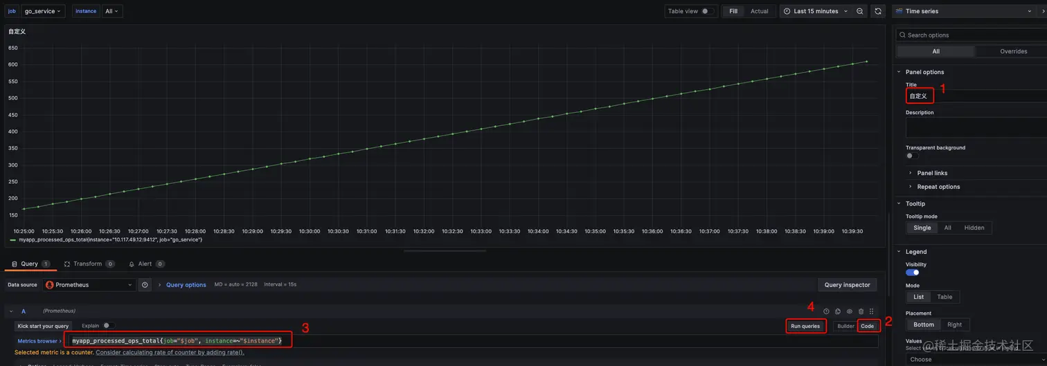 然后按照如下点击,将myapp_processed_ops_total{job="$job", instance=~"$instance"}添加到Metrics browser中,点击Run queries: