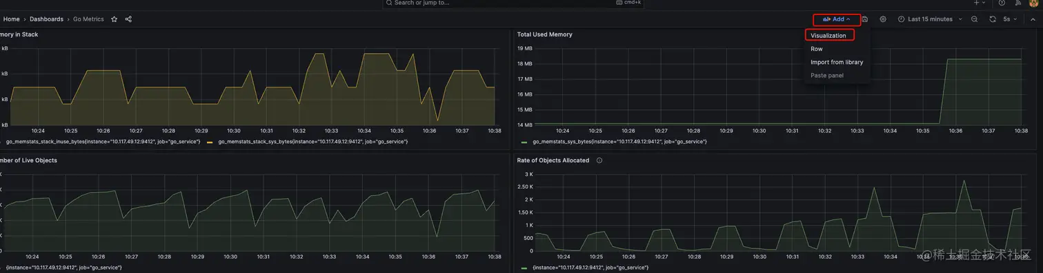 能更形象地看这个计数器的,我们在上一步Grafana仪表盘中点击Add --> Visualization: