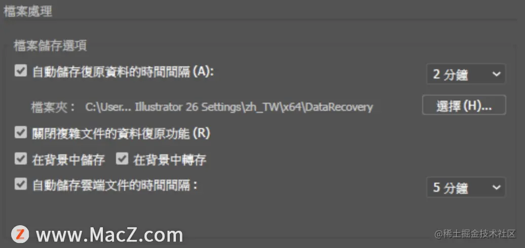 根据预设,所有illustrator 档案的自动储存(自动复原) 功能都已启用。 若要管理自动储存设定,请导览至「偏好设定> 档案处理与剪贴簿」或按下Cmd + K。