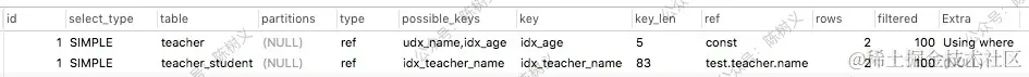 上面的输出一共有 3 条记录,其中第 1、2 条的 ID 相同,第 3 条 ID 不同。那么其执行顺序就是 ID 值越大,其越早执行。ID 相同的,按顺序执行。上面的例子,最早拿 teacher_student 表的数据,之后是一个子查询组成的表,最后拿 teacher 表的数据。结合 SQL 分析,这也符合我们的常识。因为我们必须先把子查询的值算出来,因此需要先把 teacher_student 表里的数据拿出来,之后才可以拿去 teacher 表里查询。