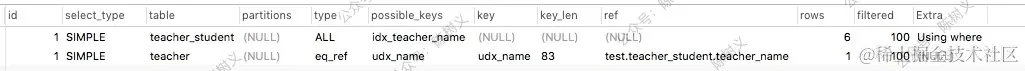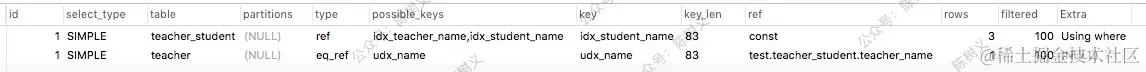 可以看出其 3 个查询都是简单(SIMPLE)查询。因为 ID 相同,所以其查询顺序是按顺序来的。首先从 teacher 表中取出数据,之后从 student 表取出数据,最后 teacher_student 表取数据。