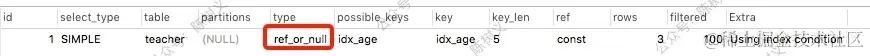 当我们增加 age is null 查询条件后,其 type 字段就变成了 ref_or_null。