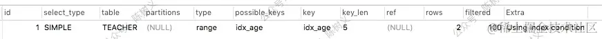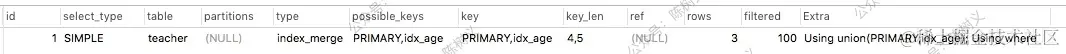可以看到使用了 index_merge 的查询类型。在 teacher 表中 id 和 age 都是索引,其将两个字段的索引结果进行合并了。