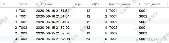 上面的输出一共有 2 条记录,其 ID 都为 1,这表示其归为一组。对于 ID 相同的组,MySQL 按照顺序从上到下执行,即:先拿 teacher_student 表的数据,再拿 teacher 表的数据。
