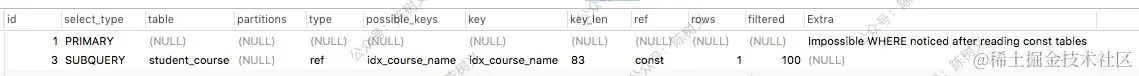 在上面的查询中,首先是执行 ID 为 3 的查询,即去 student_course 表取出选修了数学课的学生名字,之后再去进行最外层的查询。可以看到最外层查询的 select_type 为 PRIMARY。