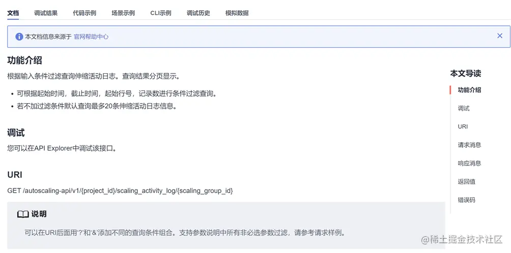 API文档包含了规范的文档结构、接口说明、请求参数 / 示例、返回参数/ 示例、错误码、SDK 等,开发者可以快速查阅 API 详情和参数说明,并可通过文档上的相关链接了解云产品的服务功能