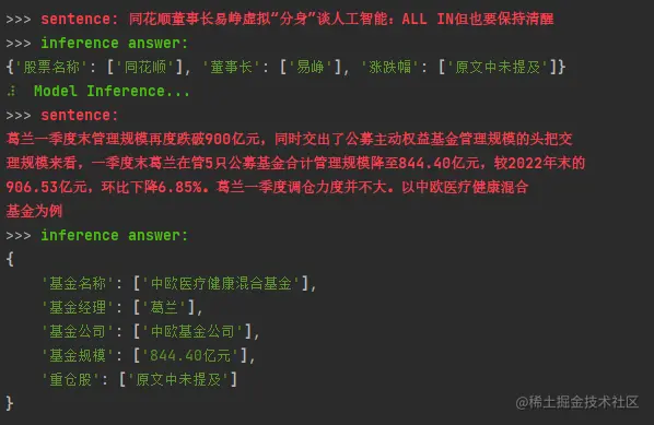 在后来的尝试中,我们在 ChatGLM 中前置了两轮对话达到了较好的效果。具体的代码 demo 可以参考 利用 ChatGLM 进行金融知识抽取,具体的效果演示参考下图: