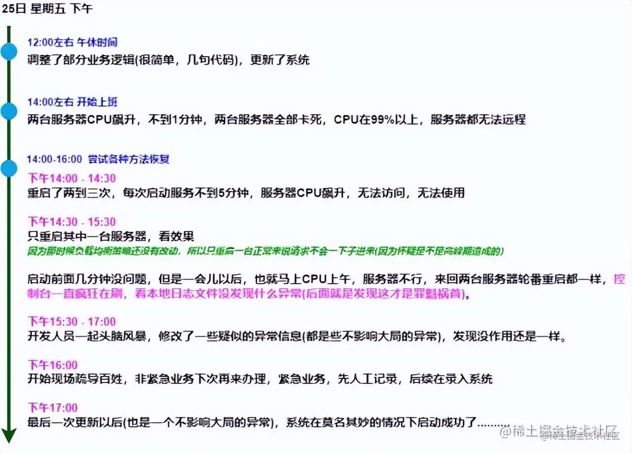 我叫上相关的所有人,开始反推当时从12:00更新开始的全过程,也把当时更新服务器的开发人员叫上,努力回想当时干了什么事情。经过将近两个多小时左右的回溯和头脑风暴,终于把事情理清楚了。