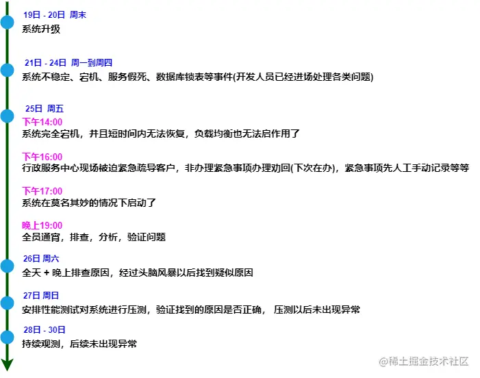 某年某月,某地区信息化系统,周末升级系统以后,后面连续一周,持续出现系统不稳定、宕机、服务假死、数据库锁表等事件。甚至星期五下午,出现三个多小时无法恢复系统,造成恶劣影响。