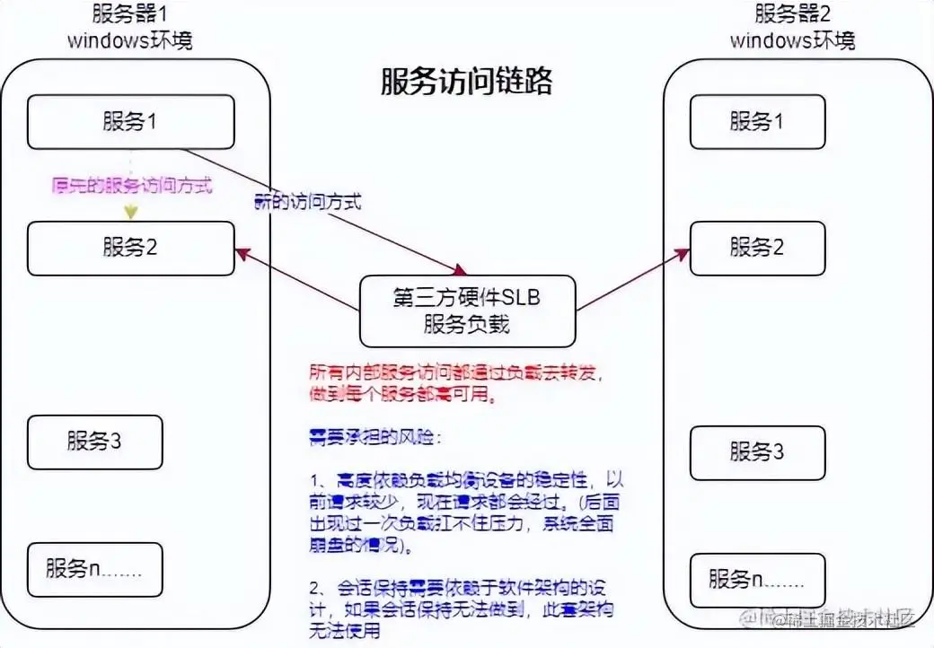 - 整体负载均衡方案也有问题,只做了服务器负载,系统整体架构是A-->B-->C这种形式的,如上图,策略只针对两台服务器的服务1所在端口做了负载,就是如果服务1端口没有问题,服务都会一直过来。如上图链路上服务2,服务3不管出现什么问题,请求还是照样会过来的。