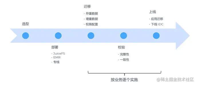 我们在 2021 年 10 月开始探索 Hadoop 的上云方案;11 月做了大量调研和讨论,基本确定方案内容;12 月和 2022 年 1 月春节前做了 PoC 测试,在春节后 3 月份开始搭建正式环境并安排迁移。为了避免导致业务中断,整个迁移过程以相对较慢的节奏分阶段执行, 迁移完后,云上的 EMR 集群数据量预计会超过单副本 1 PB.