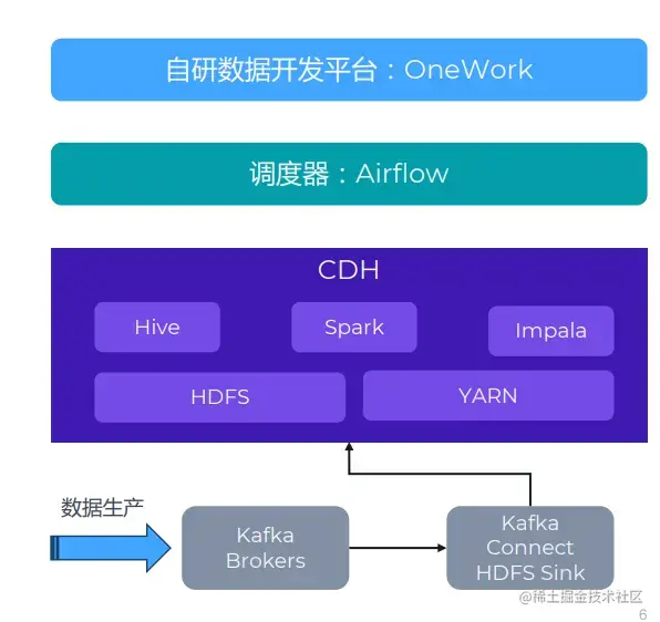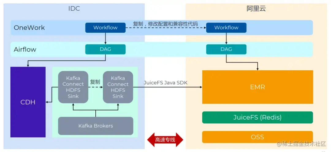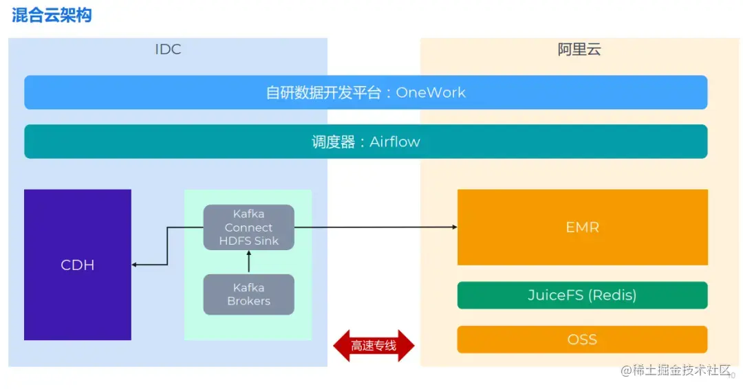 整体架构大致如上图所示:左侧是的线下机房,使用了传统的 CDH 架构和一些 Kafka 集群。右侧是部署在阿里云上的 EMR 集群。这两部分通过一条高速专线进行连接。顶部是 Airflow 和 OneWork,由于都支持支持分布式部署,因此可以轻松进行水平扩展。