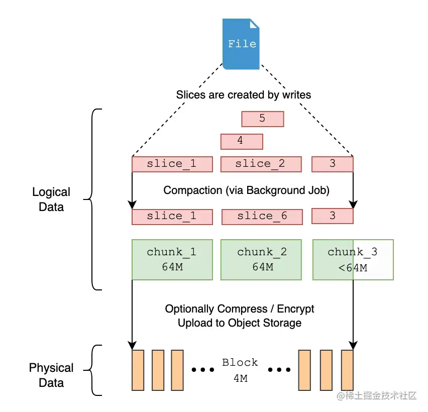 然而,JuiceFS 为了优化性能采取的数据分块模式,会对分级存储带来限制。 按照 JuiceFS 的处理,当文件存储在对象存储上时,它被逻辑上拆分为许多 chunks、slices 和 blocks,最终以 block 的形式存储在对象存储中。