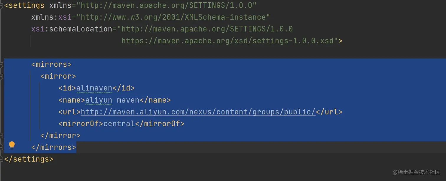 (3)由于Maven中很多源都在国外,下载速度极慢且容易断线,出现各种错误,可为IDEA中的Maven增加国内阿里云镜像