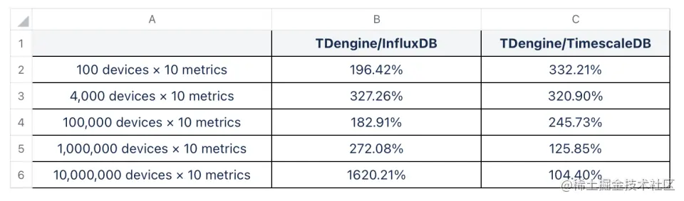 此外,我们还注意到,随着设备数规模的增加,所有系统写入基本上呈现下降趋势。TimescaleDB 在小规模数据情况下写入性能不及 InfluxDB,但是随着设备数量的增加,其写入性能超过了 InfluxDB,这点上与[TimescaleDB vs. InfluxDB]对比报告中的结论一致。