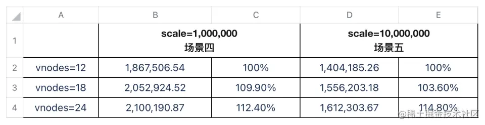 可以看到,在较多设备的场景(场景四、五)中,增加 vnodes 的数量 ,TDengine 写入性能提升明显。可见在不同规模的场景中,我们可以通过调整 TDengine 虚拟节点的数量来获得更好的写入性能。