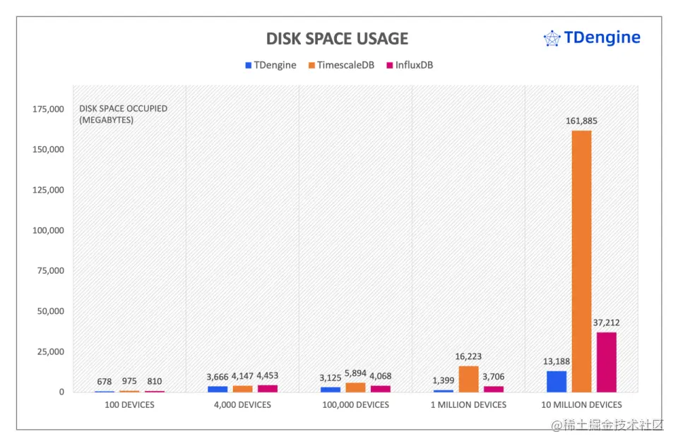 从上图可以看到,TimescaleDB 在所有的场景下数据规模均显著地大于 InfluxDB 和 TDengine,并且这种差距随着数据规模增加快速变大。其中,TimescaleDB 在场景四和场景五中占用磁盘空间超过了 TDengine 的 11 倍。在前面三个场景中,InfluxDB 落盘后数据文件规模与 TDengine 比较接近;但是在场景四/五两个场景中,InfluxDB 落盘后文件占用的磁盘空间是 TDengine 的 2 倍以上。