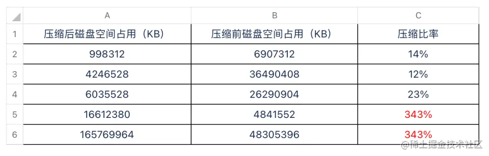 测试过程中还有个小插曲,下表反应了 TimescaleDB 的压缩比率,可以看到,TimescaleDB 在小数据规模的情况下,压缩比正常,但是在数据规模较大的场景四和场景五中,压缩以后的磁盘空间占用比例反而增大了 3.4 倍左右,疑似 bug。
