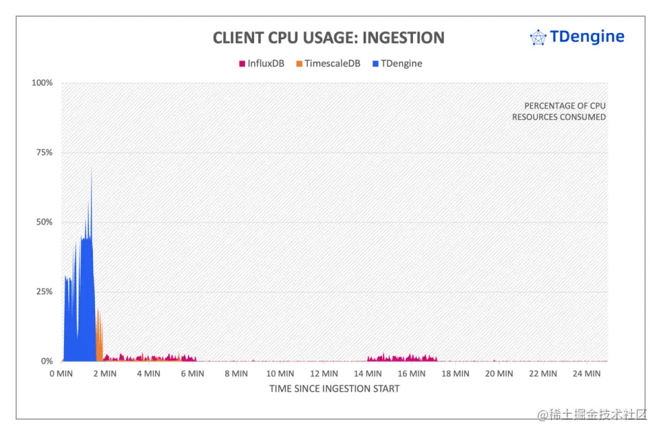 从上图可以看到,客户端上 TDengine 对 CPU 的需求大于 TimescaleDB 和 InfluxDB。InfluxDB 在整个写入过程中,从客户端整体负载来看是三个系统中计算资源占用最低的,对客户端压力最小,其写入的压力基本上完全集中在服务端,但这种模式很容易导致服务端成为瓶颈。相比 InfluxDB,TimescaleDB 对于客户端压力更大,CPU 峰值达到 20% 左右。TDengine 在客户端的开销最大,峰值瞬间达到了 70%,然后快速回落,其在客户端的开销相比于 TimescaleDB 多了 1 倍。但综合服务器与客户端的资源开销来看,TDengine 写入持续时间更短,在系统整体 CPU 开销上 TDengine 仍然具有优势。