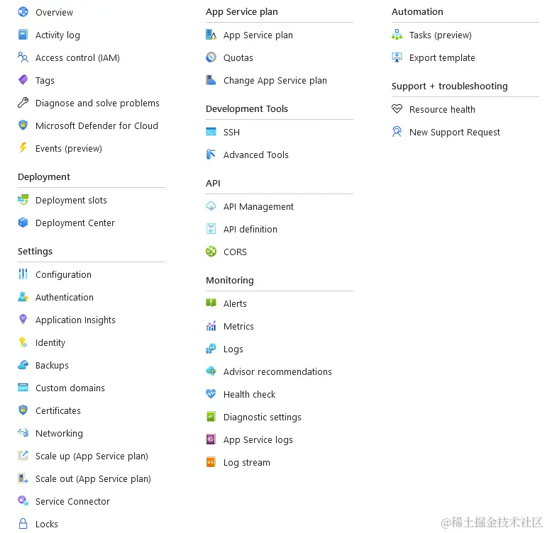 相反,托管型除了能够满足你程序的基本需求以外,它还提供更多的额外服务,比如 Digital Ocean 的 App Platform 在首页展示的 slogan 便是 "Fully-managed infrastructure",提供了包括直接从 GitHub 部署、应用监控、日志分析等功能,以我现在正在使用的 Azure App Service 为例,在界面上我可以使用到以下功能: