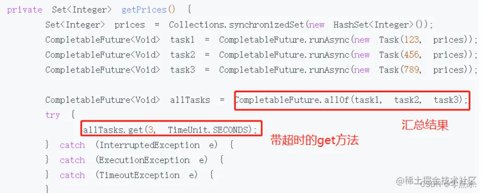 - 带超时参数的 get(long timeout, TimeUnit unit) 方法。如果在限定的时间内没能返回结果的话,那么便会抛出一个 TimeoutException 异常,随后就可以把这个异常捕获住,或者是再往上抛出去,这样就不会一直卡着了。