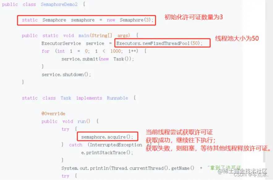 信号量会维护"许可证"的计数,而线程去访问共享资源前,必须先拿到许可证。线程可以从信号量中去"获取"一个许可证,一旦线程获取之后,信号量持有的许可证就转移过去了,所以信号量手中剩余的许可证要减一。