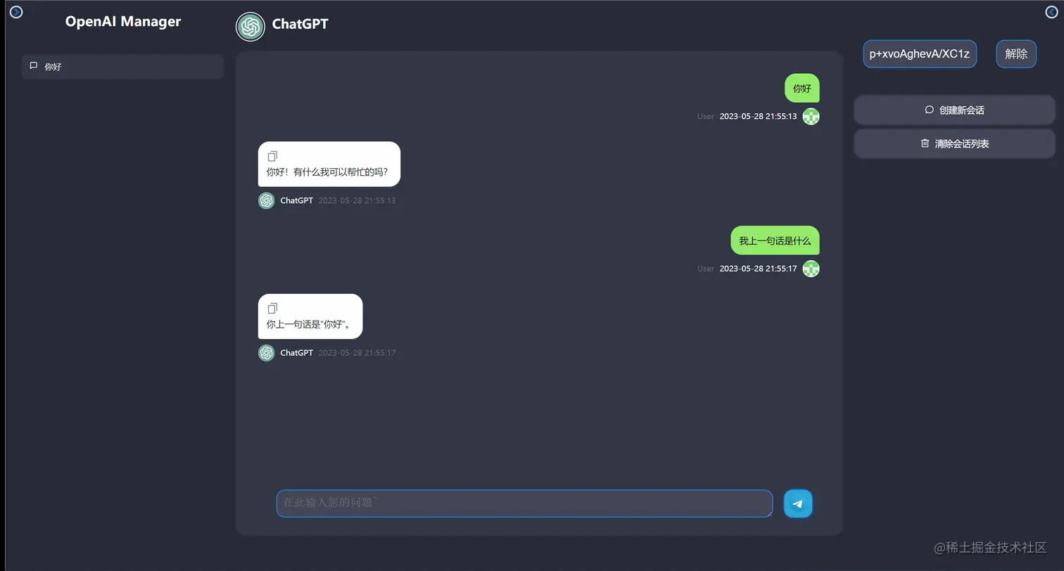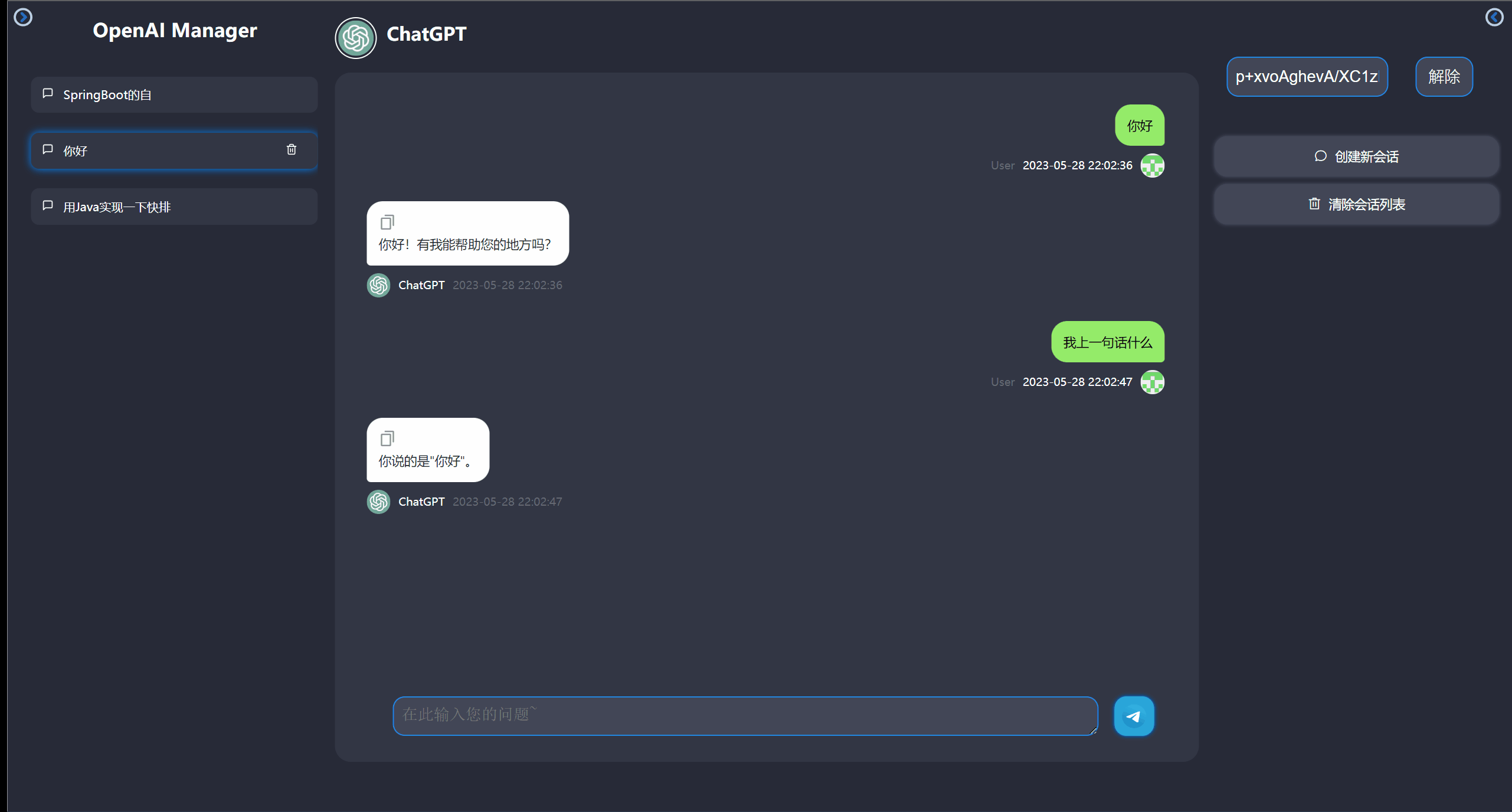 所有的会话信息会随着账号信息保存,即使刷新界面,退出浏览器,下次也可以访问到会话记录。可使用右侧清除会话列表清除所有会话,也可以点击单个会话删除会话。