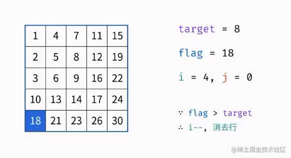 从矩阵 matrix 左下角元素(索引设为 (i, j) )开始遍历,并与目标值对比: