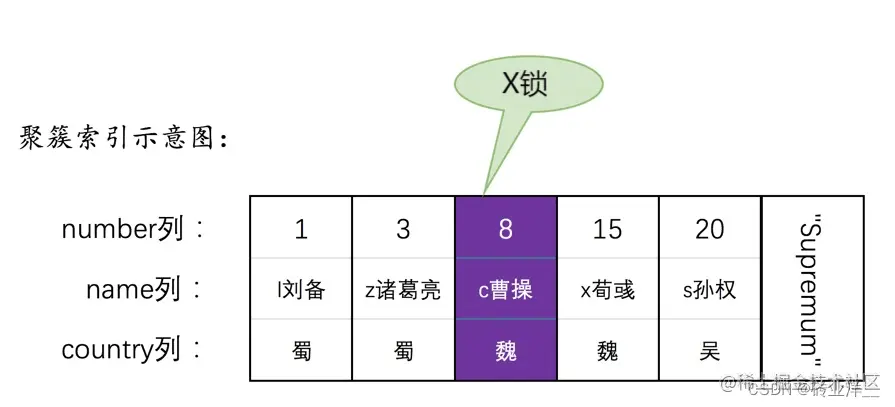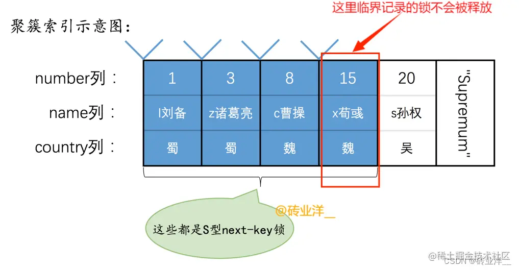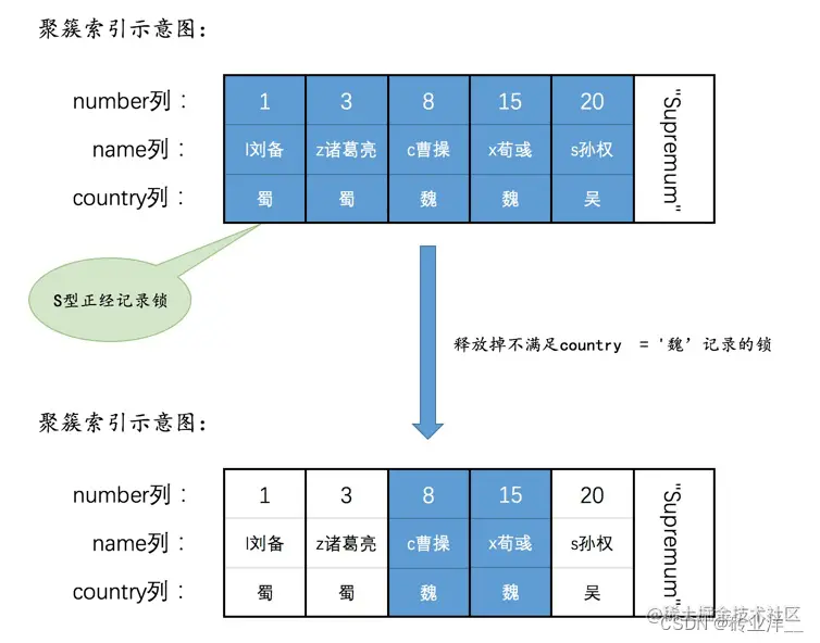 由于 country 列上未建索引,所以只能采用全表扫描的方式来执行这条查询语句,存储引擎每读取一条聚簇索引记录,就会为这条记录加锁一个 S锁 ,然后返回给 server层 ,如果 server层判断 country = '魏' 这个条件是否成立,如果成立则将其发送给客户端,否则会释放掉该记录上的锁。