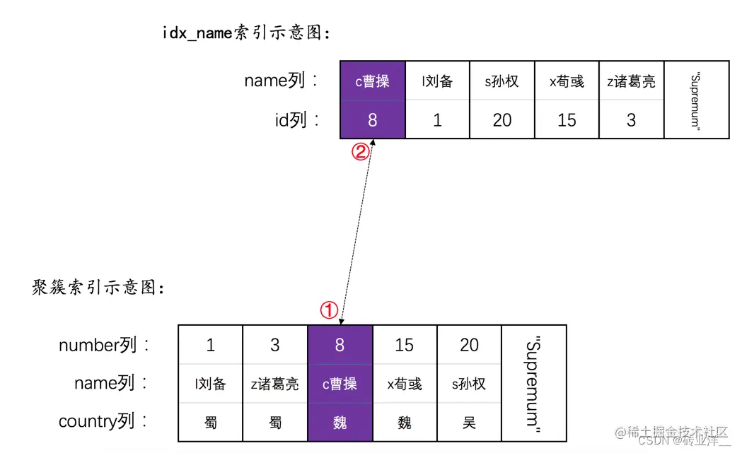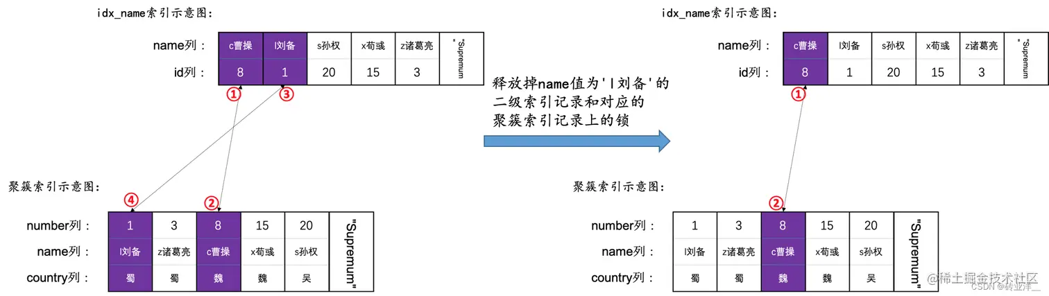 我们前边说 根据索引条件无需回表的情况只适用于 SELECT 语句,也就是说 ** UPDATE 语句过程中的锁定读都会进行回表(更新需要聚簇索引和二级索引对应的记录都更新)**,那么这个语句就会为 name 值为 'c曹操' 和 'l刘备' 的二级索引记录以及它们对应的聚簇索引进行加锁,之后在判断边界条件时发现 name 值为 'l刘备' 的二级索引记录不符合 name <= 'c曹操'< code> 条件,再把该二级索引记录和对应的聚簇索引记录上的锁释放掉。这个过程如下图所示:</=>